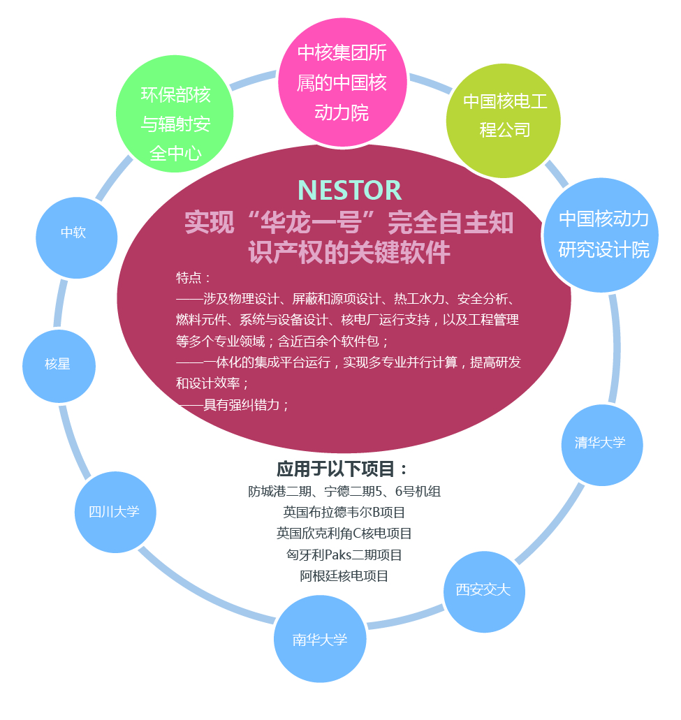 NESTOR是针对华龙一号三代核电的特征定制开发而成的我国首套自主的核电软件包和一体化软件集成平台,涉及物理设计、屏蔽和源项设计、热工水力、安全分析、燃料元件、系统与设备设计、核电厂运行支持,以及工程管理等多个专业领域。部分软件已应用于包括方家山、福清、昌江、田湾等在役电厂的技术服务,未来还将在新一代的反应堆工程设计工作发挥核心作用。
