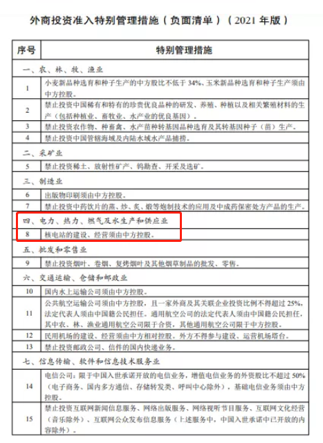 12月27日,国家发改委发布了《自由贸易试验区外商投资准入特别管理措施(负面清单)(2021年版)》 2021年第48号令、《外商投资准入特别管理措施(负面清单)(2021年版)》 2021年第47号令,其中在电力、热力、燃气及水生产和供应业方面的措施中提出核电站的建设、经营须由中方控股。