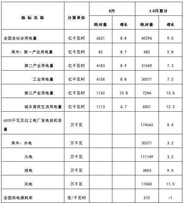 9月18日,国家能源局发布1-8月份全国电力工业统计数据。其中,1-8月,全社会用电量45296亿千瓦时。6000千瓦及以上电厂发电装机容量174642万千瓦,增长5.4%。全国发电设备累计平均利用小时2591小时:水电2338小时;火电2939小时;核电4820小时;风电1412小时。具体数据如下:
